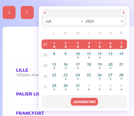Par défaut, la vue de la semaine en cours ainsi que votre établissement est affichée, vous avez la possibilité de choisir une autre semaine en cliquant sur la date en haut à gauche.