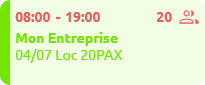 Chaque réservation est symbolisée par une box de couleur (chaque couleur est liée un type de réservation définie dans la configuration) dans laquelle vous retrouverez le type de réservation, le créneau de réservation, le nom du client, la description, la disposition de la salle, le nombre de participants et le nombre de chambres dans le cas où la salle est définie comme une chambre.