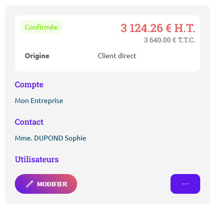 En dessous de ce bloc, vous trouverez le détail sur les acomptes, les commissions, les rappels automatiques et les commentaires.