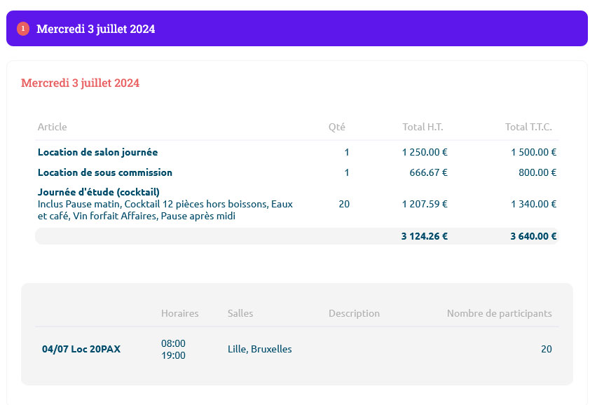 Vous y retrouverez la liste de toutes les périodes associées à cette réservation et le détail complet à la journée : articles et déroulée de la journée