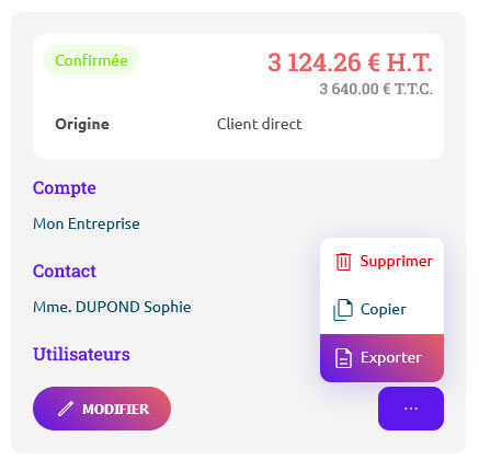 Sur la page "Planning", après avoir cliqué sur la box de la réservation que vous souhaitez, cliquez sur les bouton "..." puis sur "Exporter"