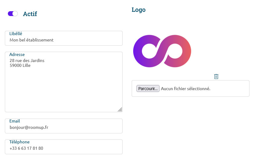 Le logo, le nom, l'adresse, le numéro de téléphone et l'adresse e-mail peuvent être modifiés dans cette partie. Tous ces éléments apparaissent dans vos devis, facture proforma, fiches de fonction, etc...