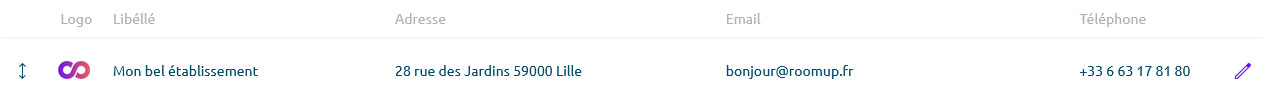 Pour modifier les informations de vos établissements, cliquez sur le crayon situé à droite du nom de l'établissement concerné.