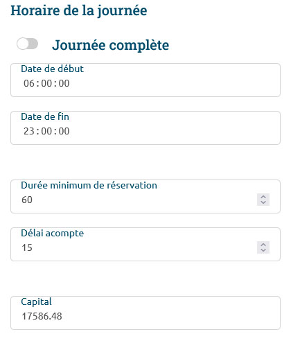 Dans cette partie, vous avez la possibilité de modifier les horaires d'ouverture de votre établissement, le créneau horaire et le délai par défaut des acomptes.