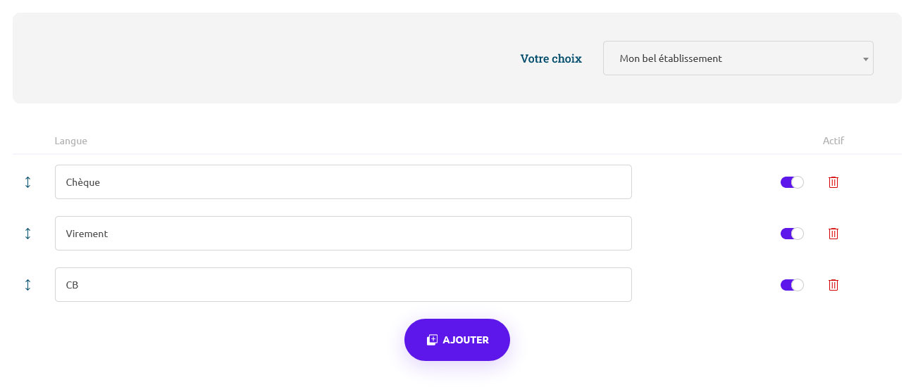 Vous pouvez modifier l'ordre d'apparition dans les formulaires, activer, désactiver ou supprimer une catégorie.